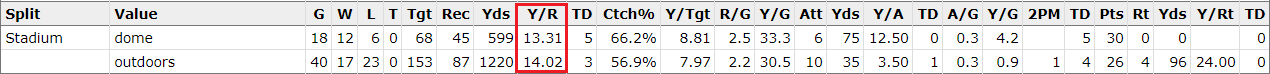 Sure, playing inside a dome can help anybody with speed but to say that Gabriel will somehow be lessened as an effective weapon when he plays outside? That’s not entirely true. His career splits tell an interesting story. According to Pro Football Reference, Gabriel actually averaged more yards per reception outdoors in his career than he has indoors.