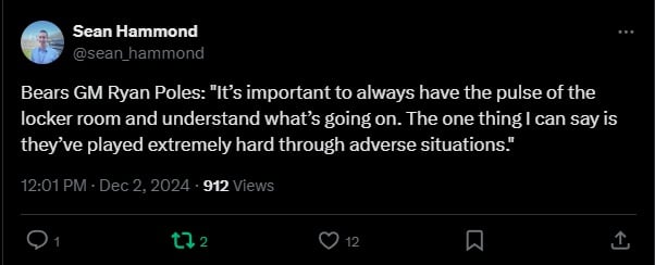 While the GM didn’t look happy to be there, he still answered questions about what happened. From his answers, it appears the decision to fire Eberflus came from two directions. First and most obvious was the former coach’s inability to manage end-of-game decisions, constantly costing the team chances to win. The other was the growing fear that the locker room may fracture beyond repair. It had become apparent that Eberflus couldn’t command it anymore.