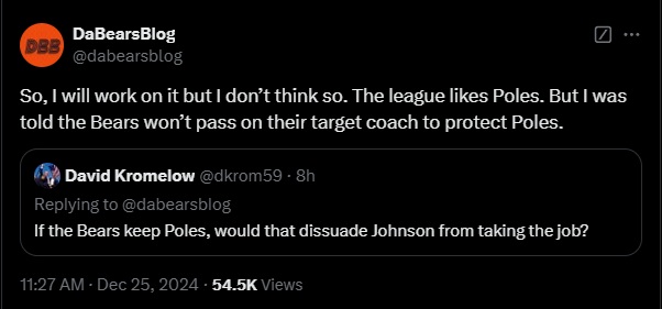 However, some felt the air had changed. Poles looked defeated at the most recent press conference. Warren seemed like somebody who’d seized control and planned to keep it that way. It has led to constant speculation about whether this partnership was destined for separation. To know for sure, two pieces of information are necessary. First is Poles’ job security. Jeff Hughes of Da Bears Blog confirmed widespread speculation that the Bears GM is far from safe, especially if the team’s desired coach is wary of working with him.