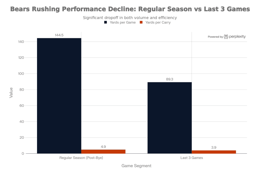 In the span of four weeks — including that heart-attack Wild Card game — the Bears’ rushing attack went from “elite powerhouse” to “anemic joke.” We’re talking about a unit that was churning out 144.5 yards per game suddenly struggling to crack 90. We went from averaging nearly 5 yards a pop to looking like we were running in quicksand at 3.9.