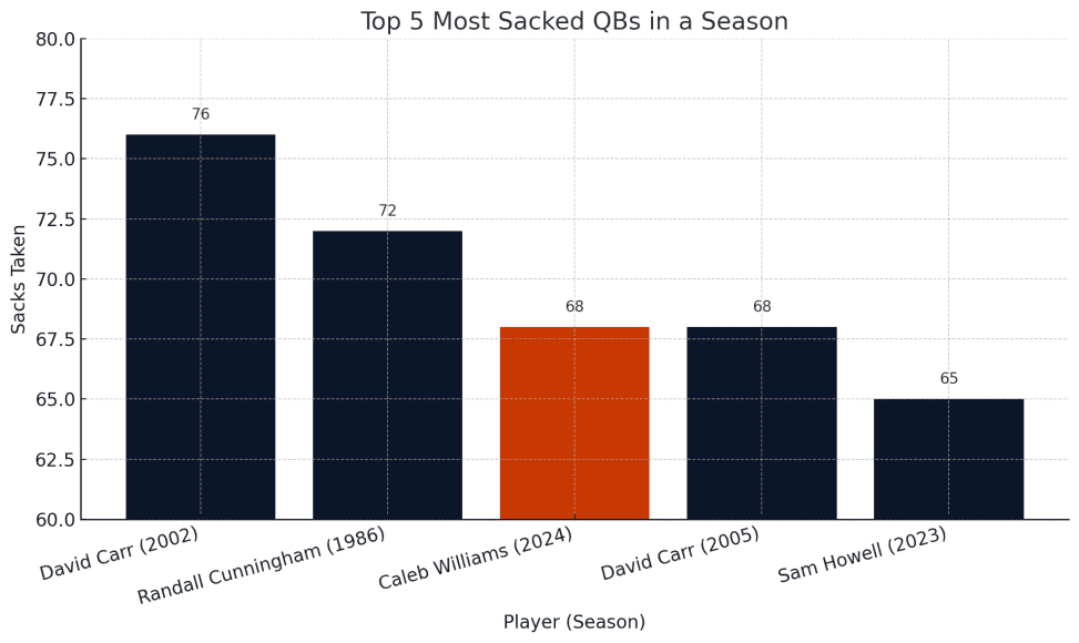 - 68 sacks allowed on Williams — only David Carr (76) and Randall Cunningham (72) had worse single-season beatdowns.