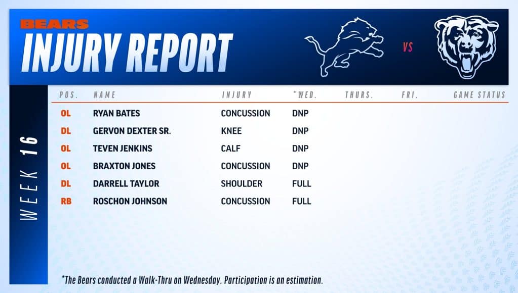 The latest injury report revealed that left guard Teven Jenkins didn’t practice on Wednesday with a calf injury. Calf problems don’t usually dissipate quickly, meaning his status for the game against Detroit is now very much in doubt. If Jones also remains sidelined, the means the Bears would be without the entire left side of their offensive line. That is before you mention Ryan Bates, their primary backup guard, is also still out with a concussion.
