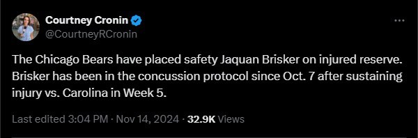 It sucks. Nobody in that building wants to admit it, but that is the truth. The former 2nd round pick has one year left on his rookie contract. There is no way GM Ryan Poles can justify signing him to an extension with this new development. It would be way too big of a risk. Jaquan Brisker may want to keep playing, which is his prerogative, but the Bears have to be the responsible party here. As he contemplates his future, they must start making preparations to find a replacement this coming off-season. They have plenty of resources to make it happen. Over $70 million in cap space. Four picks in the first three rounds. It is cold and calculated, but that is the business of pro sports.