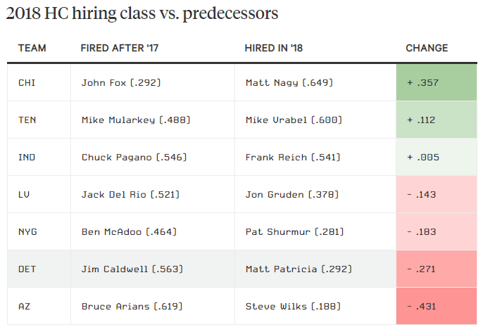 He was the guy Patricia replaced and the guy a lot of fans are starting to wish was still there. Mike Sando of The Athletic provided some ugly evidence of how bad Patricia messed up what Caldwell left behind. Complete with a chart showcasing how inferior he’s been to Nagy since the two joined the division three seasons ago.
