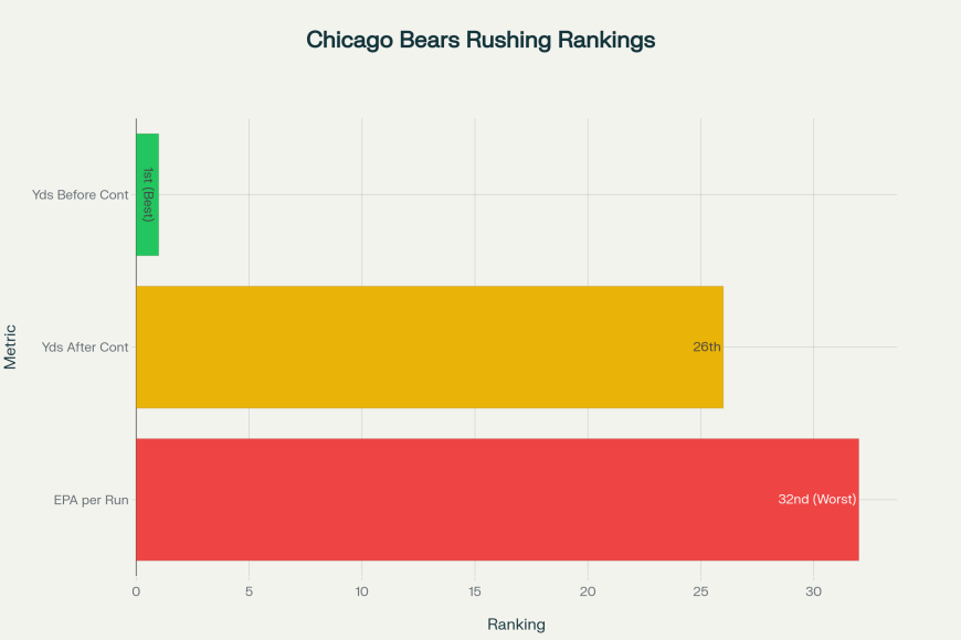 Chicago is leading the NFL in yards before contact per rush (1.89). Translation: the offensive line is doing its damn job. The Bears are creating free yards up front, opening holes, moving bodies. But here’s the sick twist—despite that advantage, Chicago is dead last in EPA per rush and 26th in yards after contact per rush. That’s not bad luck. That’s D’Andre Swift turning filet mignon into dog food.