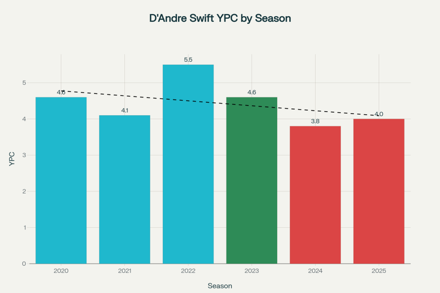 - Chicago (2024): 3.8 YPC on 253 carries.
