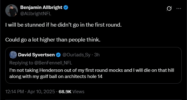 The buzz around Henderson is building. It has gotten to a point where multiple top insiders believe he is a lock for the 1st round. Benjamin Allbright of KOA Colorado went so far as to say that Chicago taking him at #10 overall isn’t out of the question. A big reason for that is the running back apparently has a relationship with running backs coach Eric Bieniemy. That would explain the team’s growing interest in him.