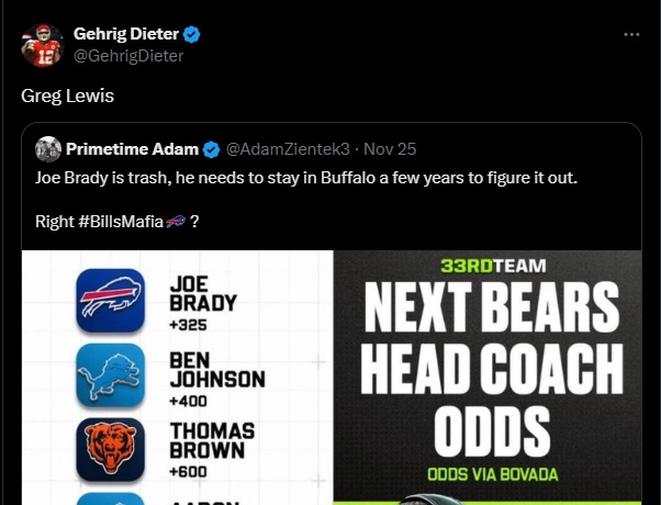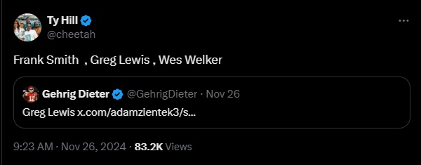 Yes, you read that correctly. The Miami Dolphins’ All-Pro wide receiver gave his unprompted recommendations for who the Bears should hire as head coach. It started when his former Kansas City Chiefs teammate Gehrig Dieter offered the idea of Greg Lewis, Baltimore’s current wide receivers coach. Hill then chimed in with two more: Dolphins offensive coordinator Frank Smith and wide receivers coach Wes Welker.