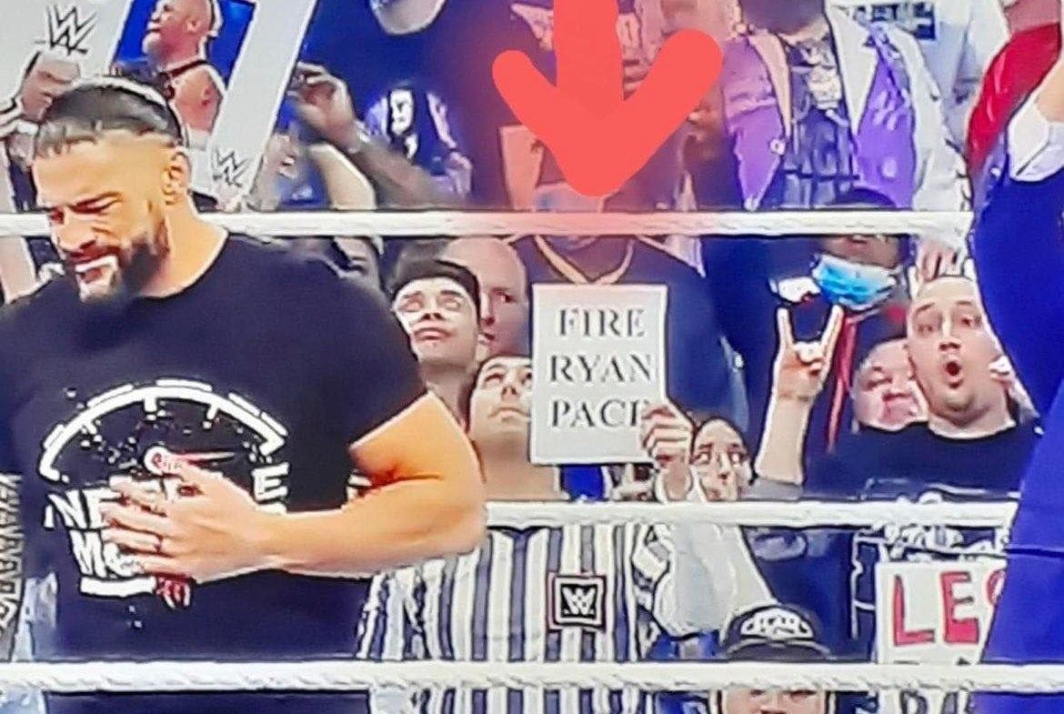 He certainly picked a big moment to do so. The nameless man got himself a front row seat for WWE Smackdown on Friday, December 17th in Chicago. During a particularly big segment where top superstar Roman Reigns fired his longtime manager Paul Heyman. Whenever the camera found him during the mayhem, the man would hold up a simple sheet of paper with the words “Fire Ryan Pace” on it.