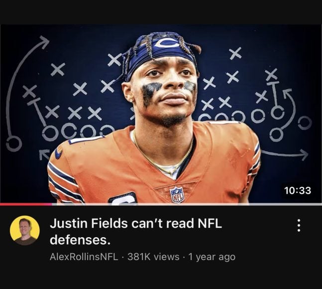 That is certainly not encouraging. It confirms what many fans and media have noticed for some time. The game still appears too fast for Williams. He still holds the ball too long at times and doesn’t seem to see the field well. That is why he often misses opportunities for easier completions. Yet what makes this video so depressing is that it’s not the first. Bears fans who know Rollins’ work have likely seen this before. After all, he released almost an exact duplicate nearly two years ago to the day.