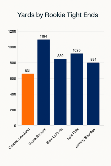 My bold take? Loveland finishes third among rookies in receptions & yards, grabs top-10 TE fantasy ranking, and becomes a weekly must-start — all without hogging the headlines like Bowers did.