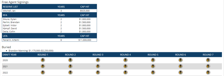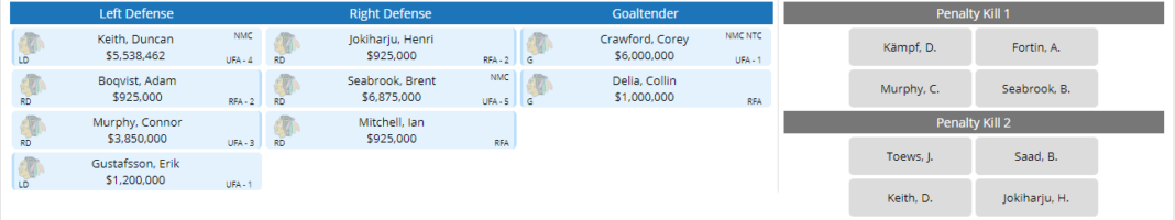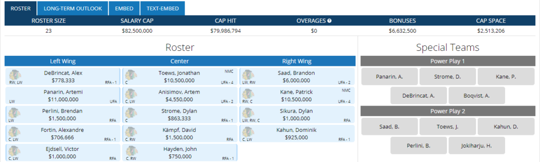 Keep in mind, Alex DeBrincat, Dylan Strome, and a few other players will need a contract extension, so cap space will be critical going forward. There are a few additional moves that I didn’t include in my theoretical CapFriendly 2019-20 Chicago Blackhawks virtual team.