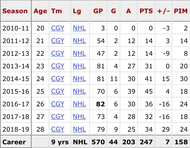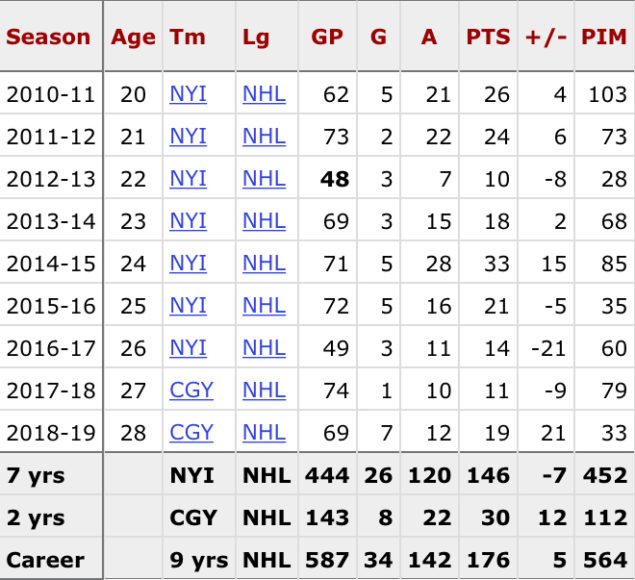 Travis Hamonic is another Calgary Flames defenseman that seems to be available. The St. Malo, Manitoba native had a strong 2018-19 campaign on the second pairing with Noah Hanifin. Much like TJ Brodie, Hamonic also had the best possession numbers of his career last season. He scored a career-high seven goals and was a shutdown presence on the penalty kill. Hamonic is a sturdy right-handed defenseman that has averaged at least 20 minutes per game in each of his nine NHL seasons. He’s a fierce competitor as well as an above-average shot blocker. Hamonic would immediately slide into a top-four role for the Blackhawks. With an extremely reasonable $3.875M cap hit, Travis Hamonic could make sense for the Blackhawks.