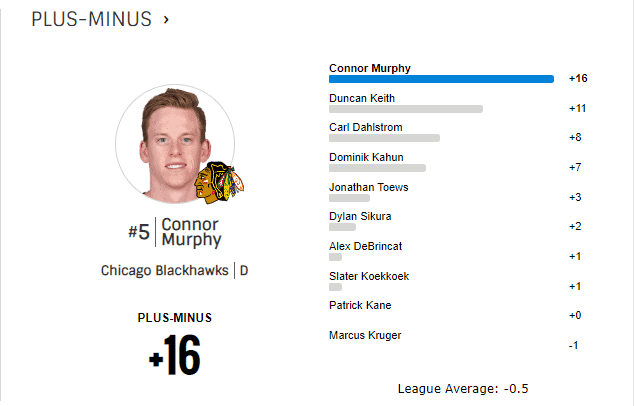 Connor Murphy leads the Blackhawks with a 16± rating and is T-49th amongst league leaders (via NHL.com)