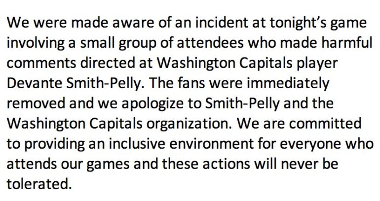 “There’s absolutely no place in the game of hockey or in our country for racism.” — #Caps Coach Barry Trotz on an incident involving Devante Smith-Pelly on Saturday in Chicago. Four fans were ejected for taunting DSP when he was in penalty box. pic.twitter.com/kxn3uClSBY