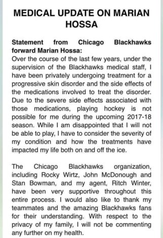Marian Hossa and the Chicago Blackhawks have released a statement about his health following last night’s report, and it’s not good. Hossa will miss the 2017-2018 season.