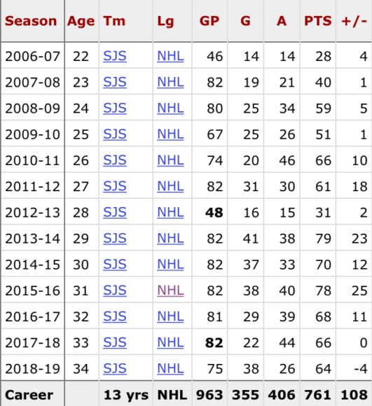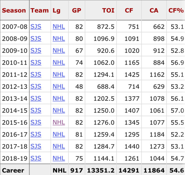 The 2003 7th-round pick has also posted some ridiculous possession numbers throughout his career. Pavelski’s worst Corsi% of his career was 52.2% in 2016-17. To put that into perspective, Brandon Saad was the only Blackhawk forward that had a Corsi% higher than 52.2% last season. Pavelski not only provides above-average offense, but he plays superb defense as well.