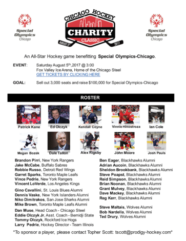 On Saturday August 5, former NHL players, Blackhawks past and present as well as local personalities will participate in a hockey game to benefit Special Olympics Chicago. The Chicago Hockey Charity Classic will take place at Fox Valley Ice Arena in Geneva at 3pm.