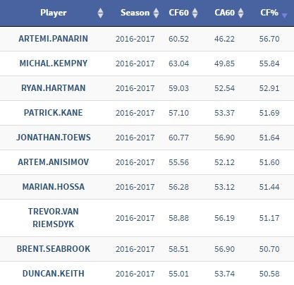 Corsi measures shot attempt differential. When Hartman is on the ice, almost 53% of the shots are in the Blackhawks favor.