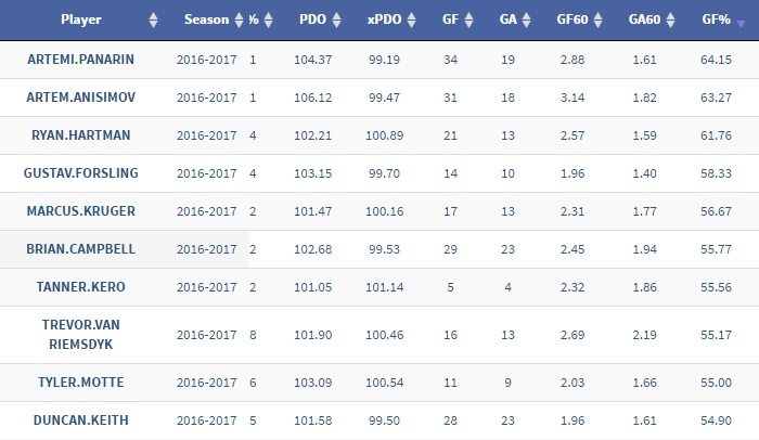 Basically, 56% of the goals scored while Hartman is on the ice are for the Blackhawks.