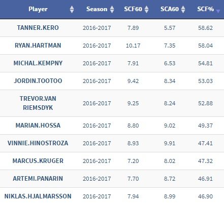 This is a bit more difficult to explain but basically the Blackhawks get 58% of the quality scoring chances while Hartman is on the ice. More info can be found here.