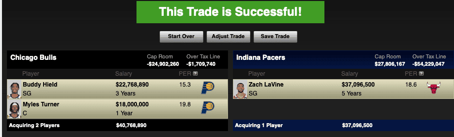 Both teams should consider themselves lucky if they can complete a deal like this one. Simply put, the Pacers have been shopping this trade package the entire summer and were unsuccessful in finding a suitor. Swapping Buddy Hield for Zach LaVine and then adding Myles Turner on top of that may not be the package the Pacers envisioned at the start of the summer, but the reality is slowly kicking in. The Pacers have a superstar on their hands with Tyrese Haliburton. They need to put talent around him so he can continue to grow. LaVine is the perfect fit next to Haliburton since he is a pass-first guard looking for his teammates before himself. LaVine is a shoot-first guard looking to score on every possession. The Bulls would be adding much-needed size in the front court. They can have the flexibility of playing Nikola Vucevic and Myles Turner together since they can both play behind the arc, but now they can both rebound too. Vucevic failed to sign an extension with the Bulls last summer. A deal like this could give the Bulls an insurance policy if Vucevic walks in free agency.