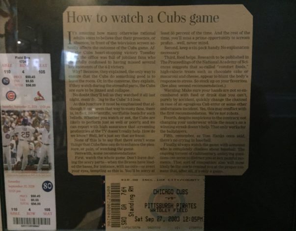 The tickets are joined by an article that I cut from the Chicago Tribune during the 2003 NLCS (The Bartman series). I read it at the time and it explained how I watch Cubs games perfectly.