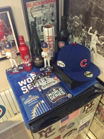 The championship memorabilia also includes an Anthony Rizzo and Kris Bryant bobblehead, an official World Series patch, bottles of championship booze (some drank already) and about 10 t-shirts that are not included in the picture.