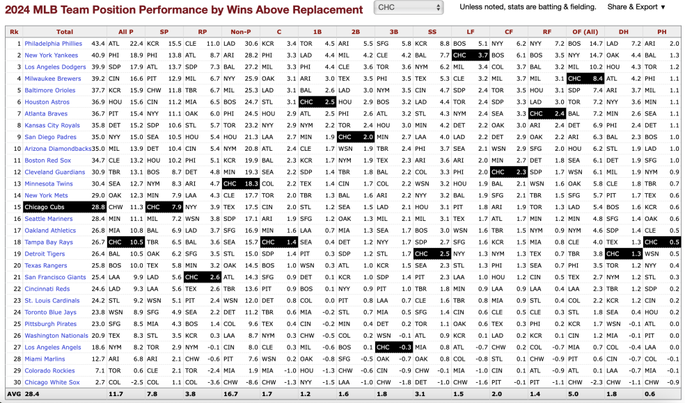 The Cubs have a 3.7 WAR (wins above replacement) from the left-field position in 2024. That is second to the Boston Red Sox and just ahead of the Milwaukee Brewers. The league-average WAR for left field in 2024 is 1.5. Happ (and the other 13%) more than double that number. Happ’s WAR on his own is 3.9, 0.2, which is better than the team’s statistic.