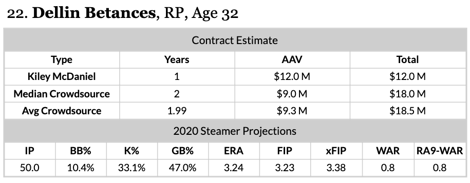 Because Pomeranz obviously has previous success as a starting pitcher, there will be other teams who will give him a chance to return back to a starting rotation. But right now, you can make the case that he’s top reliever on the market after his velocity spiked up after his transition to the bullpen in 2019 and his ridiculous strikeout rate.