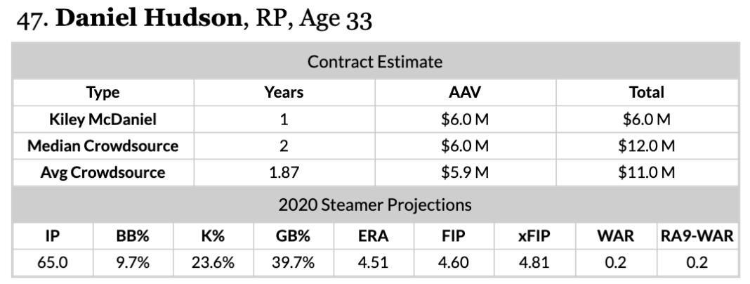 Daniel Hudson made his MLB debut with the White Sox in 2009. He was still trying to breakthrough as a starter in 2012, but eventually went to the bullpen on a full-time basis. He had some moderate success, but 2019 was his first great year as a reliever, combining to pitch 73 innings with the Blue Jays and Nationals. He had a 2.47 ERA and emerged as one of the few trusted relievers in Washington’s bullpen during the postseason.