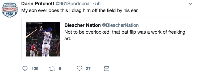 I just can’t comprehend why anyone would get so mad about a bat flip, but for whatever reason some fans think it’s disrespectful and that includes Darin Pritchett, who happens to be the South Bend Cubs radio play-by-play announcer.
