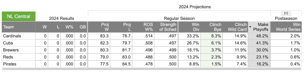 Heading into Opening Day, FanGraphs pre-season projections has the five NL Central teams separated by six games, with the St. Louis Cardinals starting as the favorites over the Cubs to win the division according to FanGraphs’ odds.