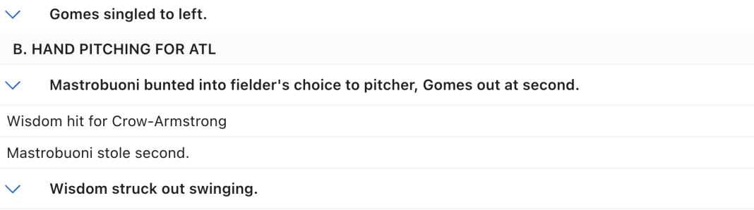 Mastrobuoni bunted back to the pitcher, who got Gomes out at second. Ross then pinch-hit Patrick Wisdom for Pete Crow-Armstrong. Wisdom struck out. Nico Hoerner then made the final out in the inning.