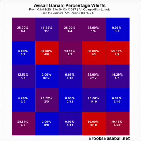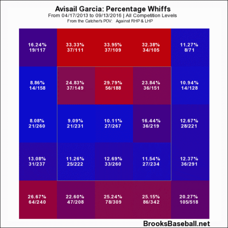 Take a look at Avi’s heat map from 2013 to the end of 2016. (Whiff rate only)