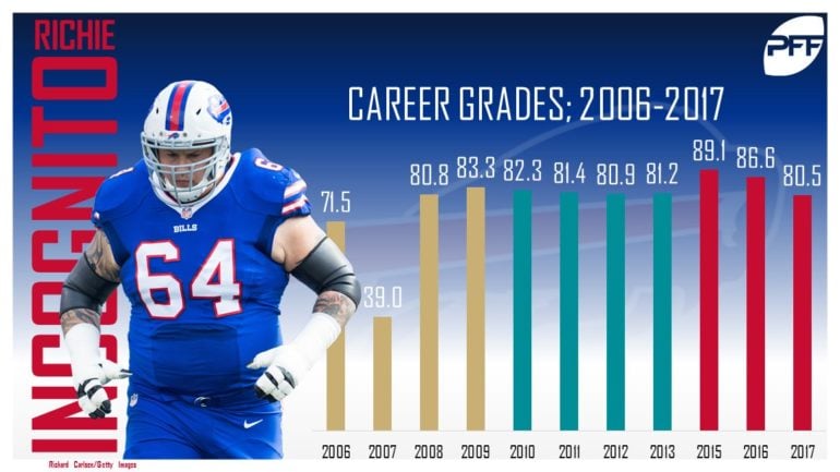 He has consistently graded out as one of the top lineman in the NFL, when healthy and in control. While it dipped some in 2017, he was still named to the Pro Bowl while leading the perennially terrible Buffalo Bills to the team’s first playoff game since 1999.
