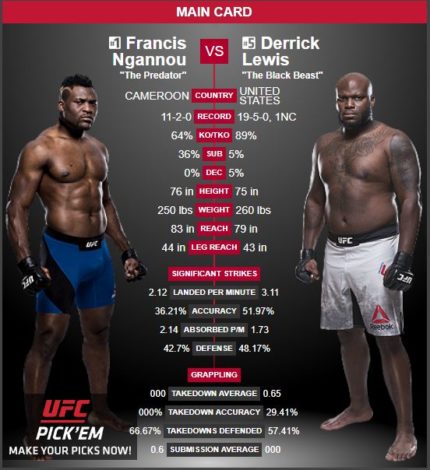 Similar to Ngannou, Lewis is 4-1 in his last five fights. His loss came by way of Mark Hunt who TKO’d Lewis. “The Black Beast” has had plenty of success in the octagon, beating Roy Nelson by decision, and knocking out Shamil Abdurakhimov. Lewis also sandwiched knockouts around his loss to Hunt by knocking out Travis Brown before, followed by Marcin Tybura after his fight with Hunt.